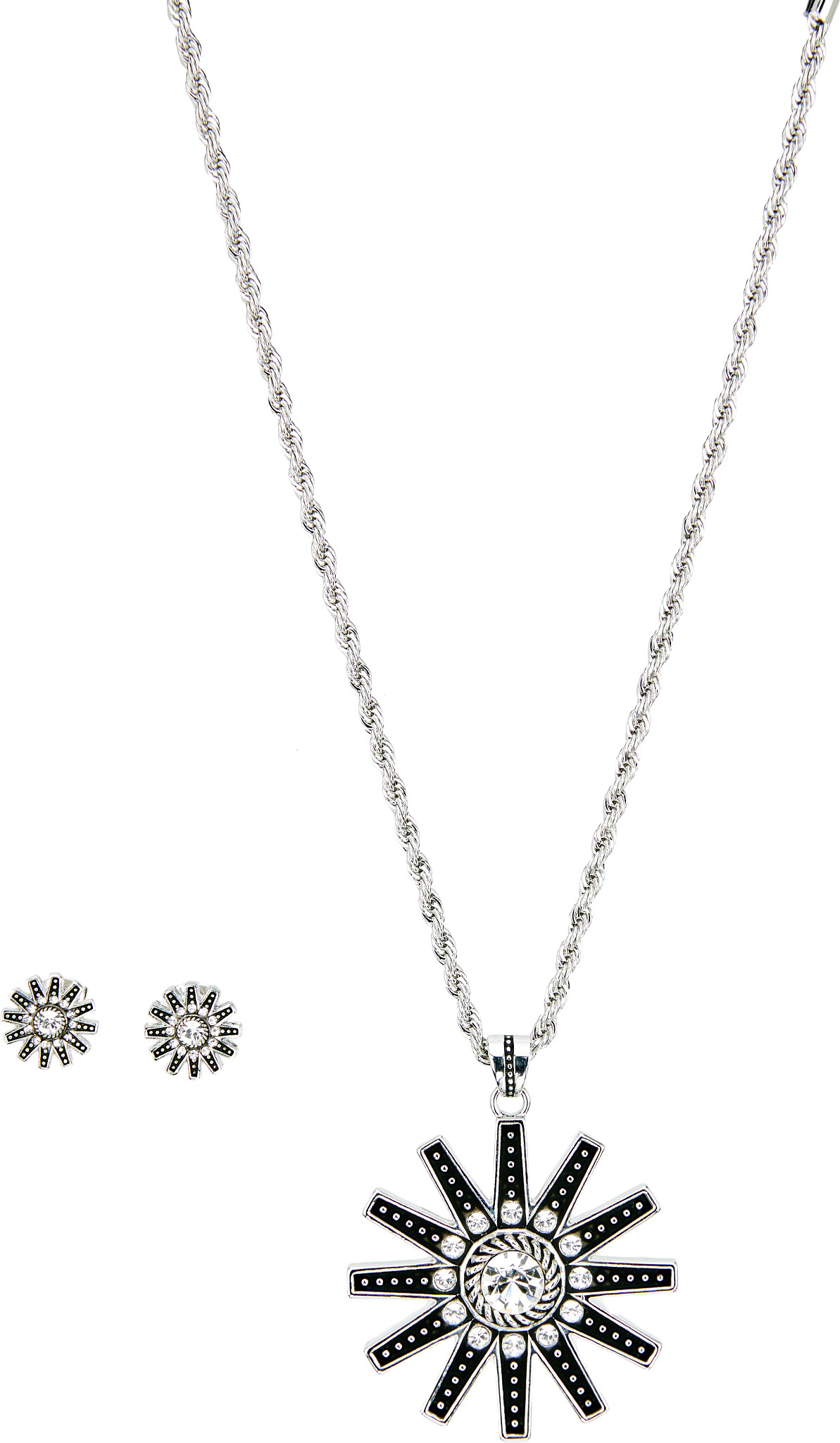 This earrings and necklace set feature a pair of silver earrings and a silver necklace, both made from zinc alloy with silver plating. The earrings feature a butterfly post attachment while the 16” necklace has a 3” extender. Both feature a sun-shaped like design with a black accent.