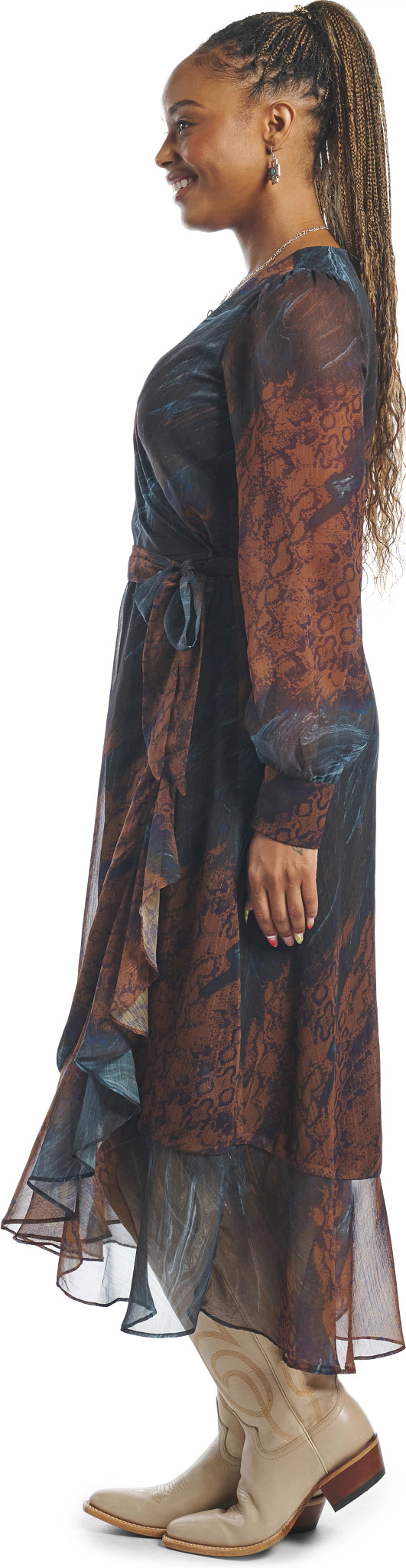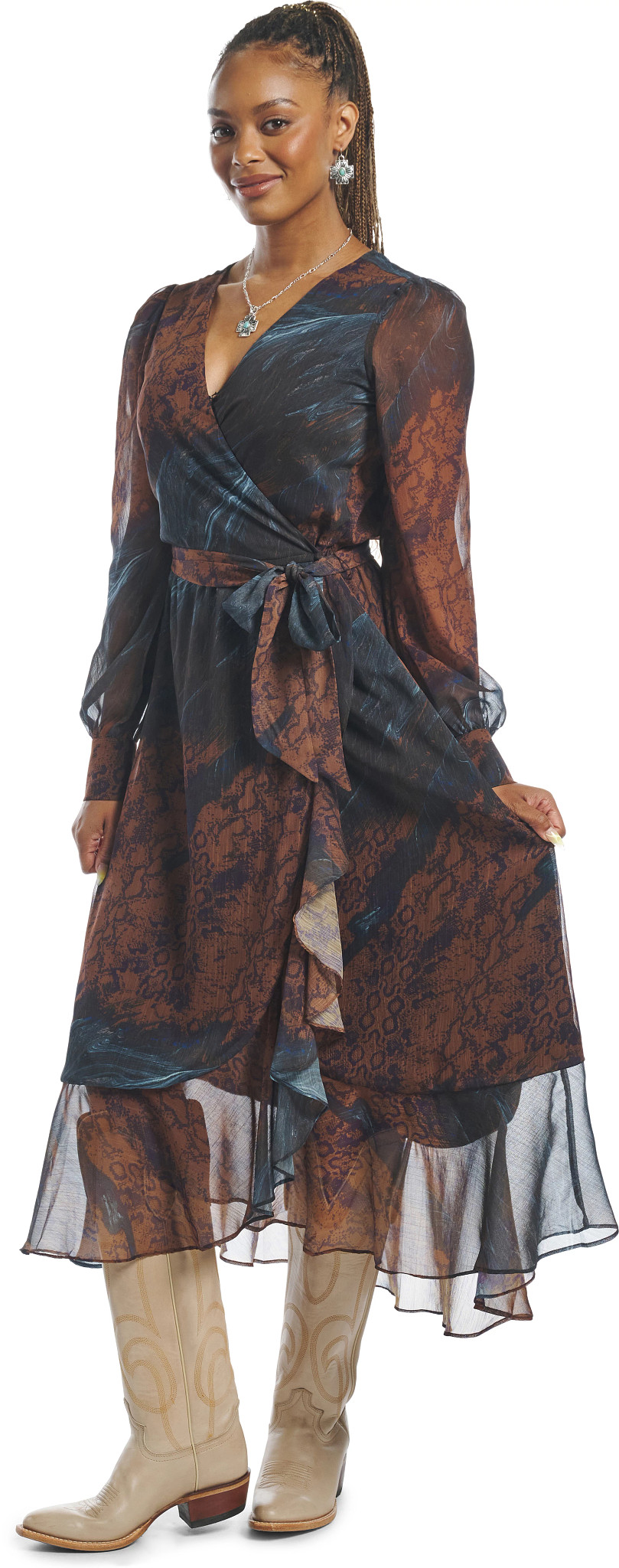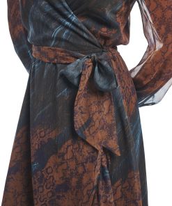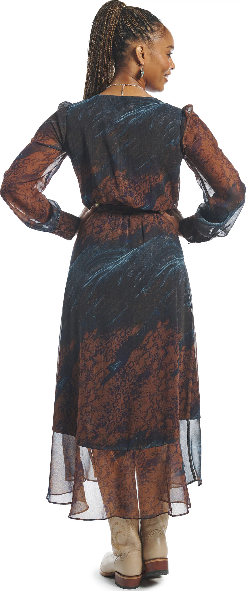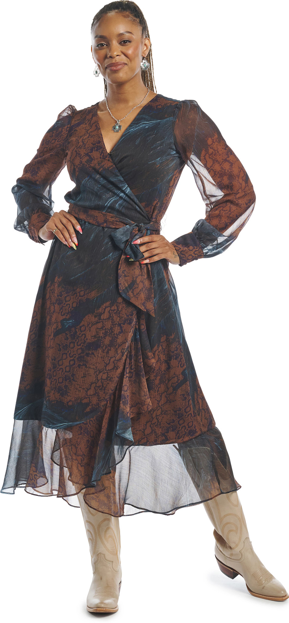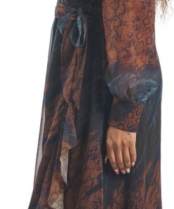 Elevate your wardrobe with this sophisticated maxi wrap dress. Featuring a captivating blend of patterns and textures, it offers a flattering silhouette with a tie-waist that defines your shape. The long, sheer sleeves and flowing skirt create a graceful look, perfect for any special occasion or evening out. This dress combines elegance with a touch of modern edge, making it a standout piece in any closet.
