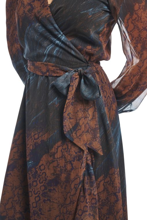 Elevate your wardrobe with this sophisticated maxi wrap dress. Featuring a captivating blend of patterns and textures, it offers a flattering silhouette with a tie-waist that defines your shape. The long, sheer sleeves and flowing skirt create a graceful look, perfect for any special occasion or evening out. This dress combines elegance with a touch of modern edge, making it a standout piece in any closet.