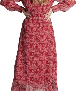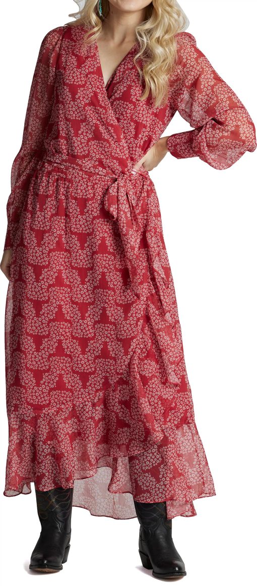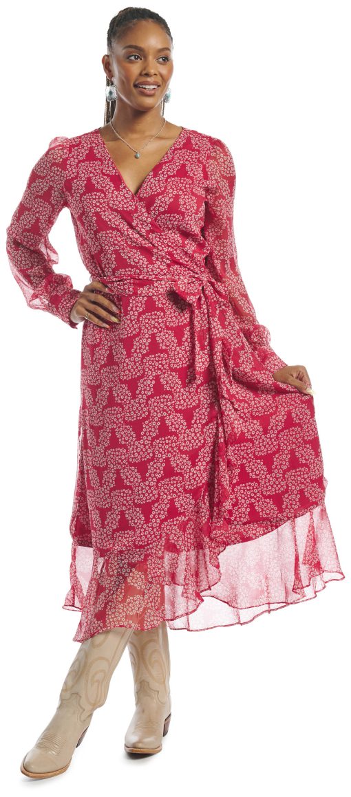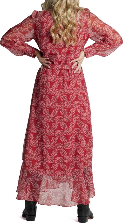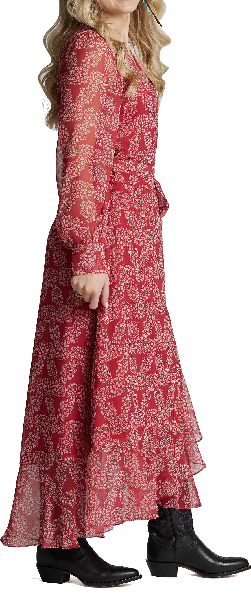 Elevate your Western style with our Red Floral Wrap Maxi Dress featuring a unique longhorn skull pattern. This vibrant dress effortlessly blends classic charm with a touch of the frontier. The flattering wrap design and sweeping maxi length make it a perfect choice for a bohemian-inspired look. Embrace the spirit of the West with a bold splash of red and a distinctive longhorn skull motif, making this dress a standout piece in your wardrobe.