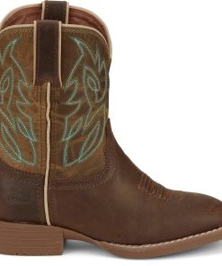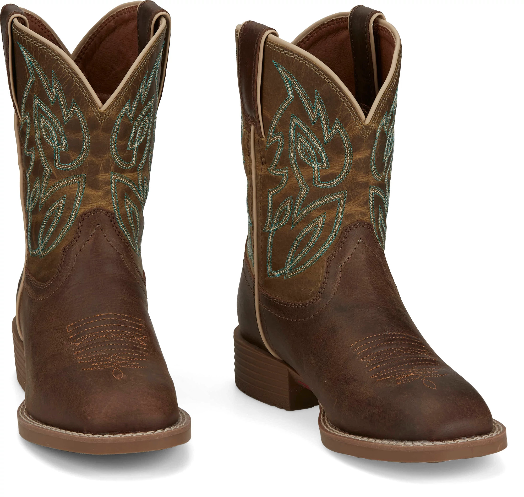 Crafted for young adventurers, these boots feature a durable brown leather exterior with intricate green and white stitching, adding a touch of Western flair. The easy pull-on design ensures a snug fit, making them perfect for active kids on the go. With a sturdy rubber sole for reliable traction, these boots are built to withstand every playful adventure, providing both comfort and durability. Perfect for everyday wear, the Cantor Junior Kids Boots are a must-have for any little cowboy or cowgirl.