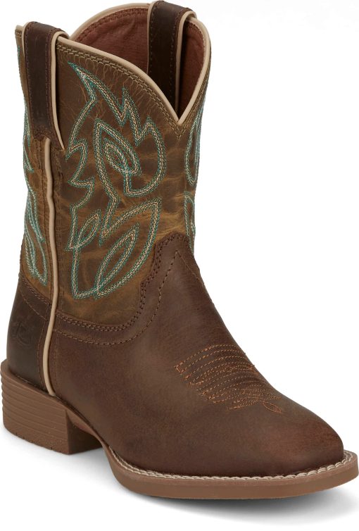 Crafted for young adventurers, these boots feature a durable brown leather exterior with intricate green and white stitching, adding a touch of Western flair. The easy pull-on design ensures a snug fit, making them perfect for active kids on the go. With a sturdy rubber sole for reliable traction, these boots are built to withstand every playful adventure, providing both comfort and durability. Perfect for everyday wear, the Cantor Junior Kids Boots are a must-have for any little cowboy or cowgirl.