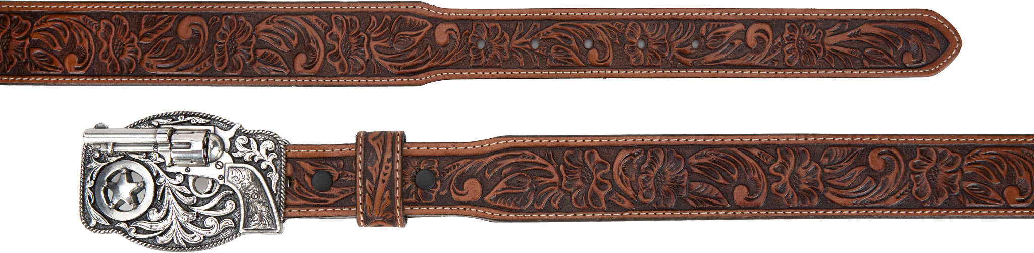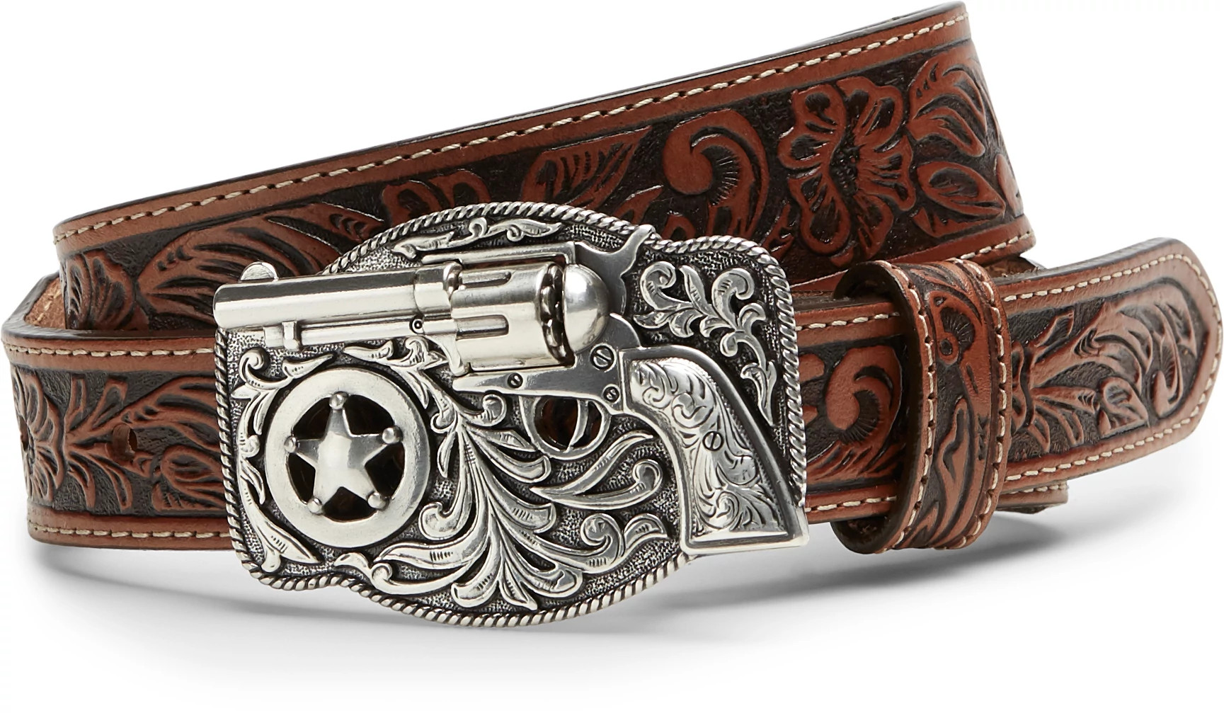 Get ready to saddle up with our Kids’ Wild West Tooled Leather Belt! This belt is all about fun and flair, with super cool tooled details and a sleek tapered end. The eye-catching silver buckle, featuring a revolver and star, makes every outfit feel like a rootin’-tootin’ adventure. Crafted from top-notch leather, it’s tough enough for any escapade and comfy enough for everyday wear. Perfect for jeans, cowboy outfits, or any gear that needs a touch of the Wild West.