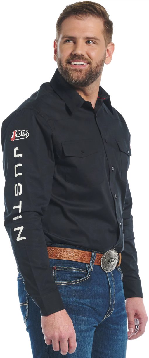 Make a statement with our stylish collared shirt adorned with the Justin logo, perfect for any occasion.