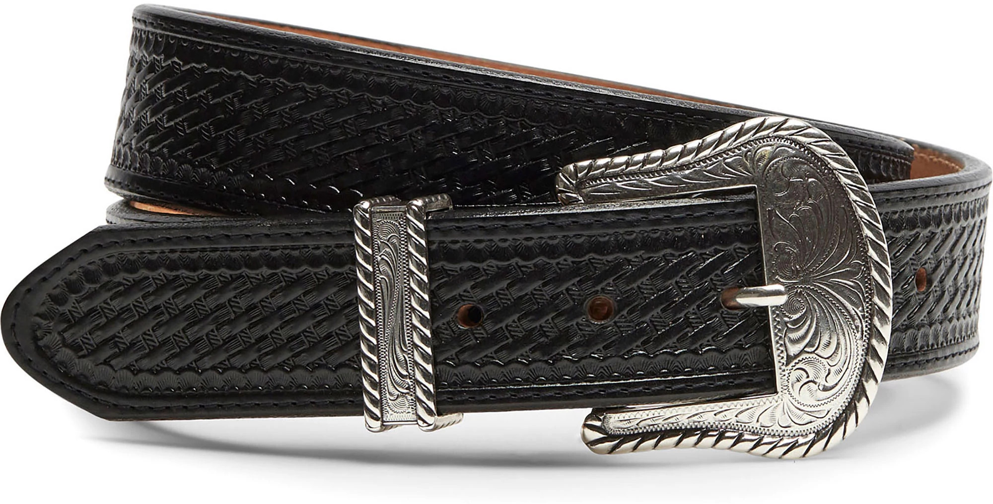 Crafted with a striking embossed basketweave design, this belt features a unique look with a rich texture.