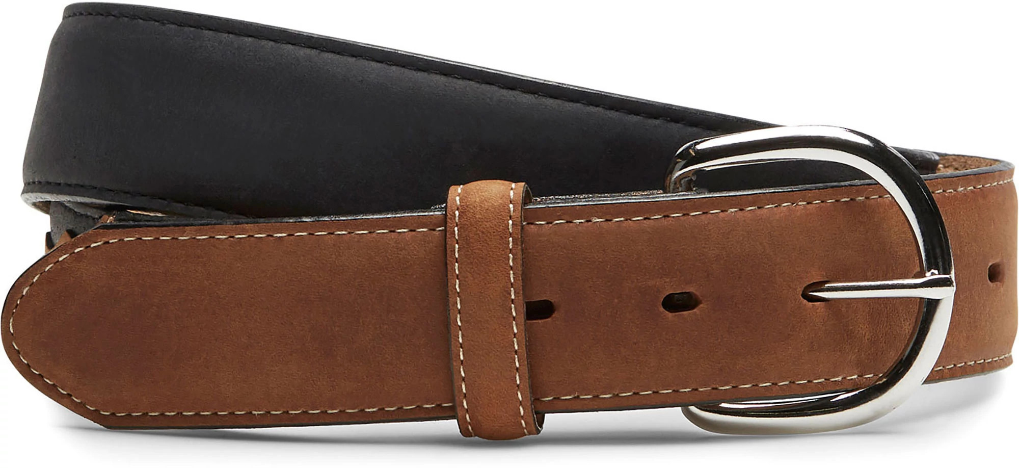An iconic style in two-tone leather for an eye-catching look. This belt is finished with a nickel buckle for timeless style.