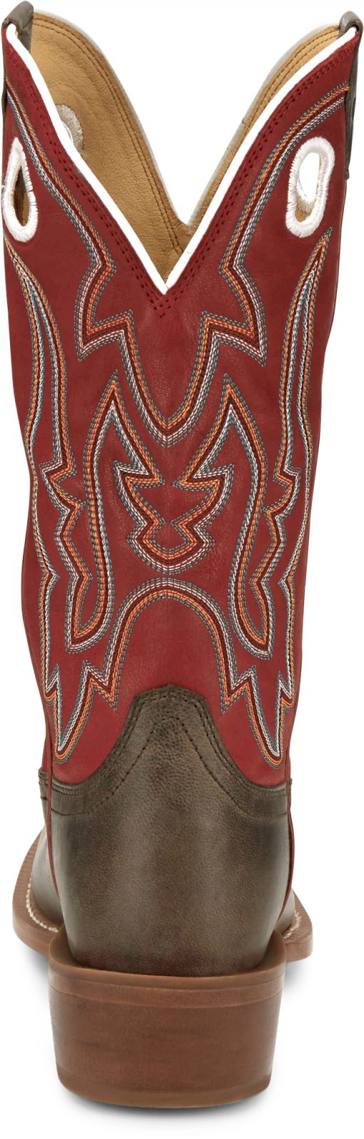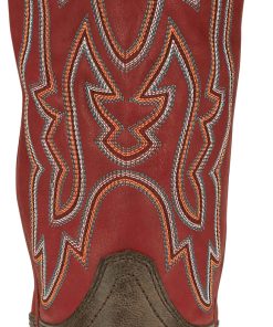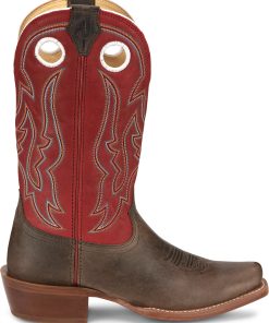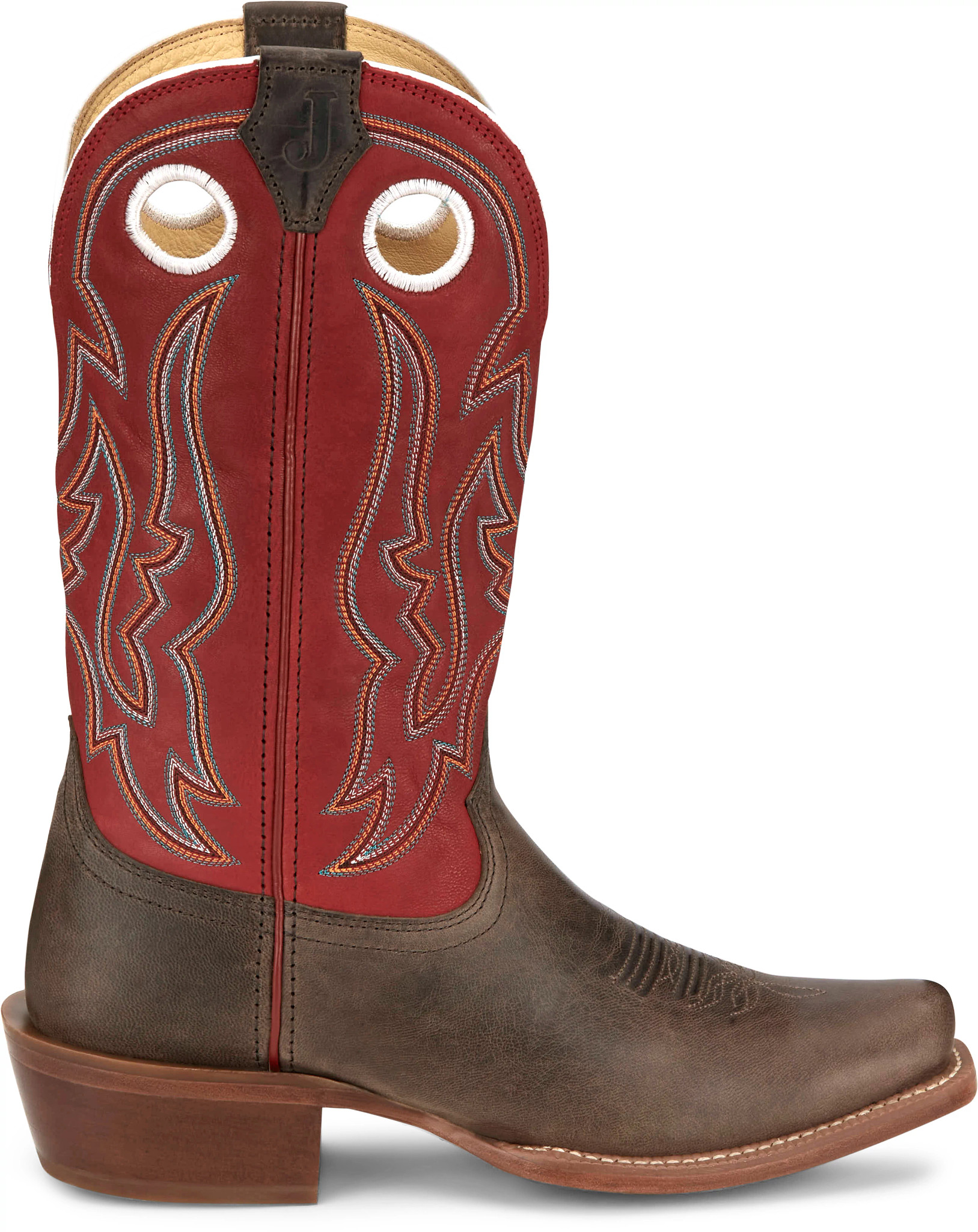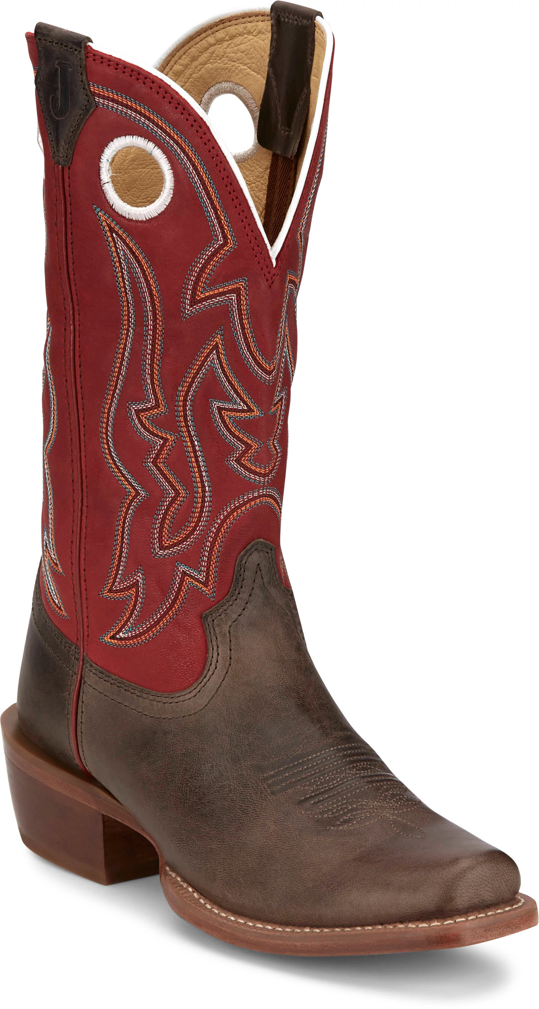The Ante Up boot combines a distressed hickory-brown leather foot with a vibrant Justin red shaft, accented by classic Western stitching. Equipped with pull holes for effortless on-and-off, it also sports a medium square toe adorned with a decorative toe stitch. This boot offers flexibility for both casual and semi-formal occasions.