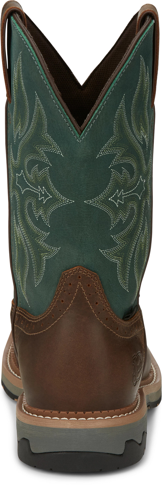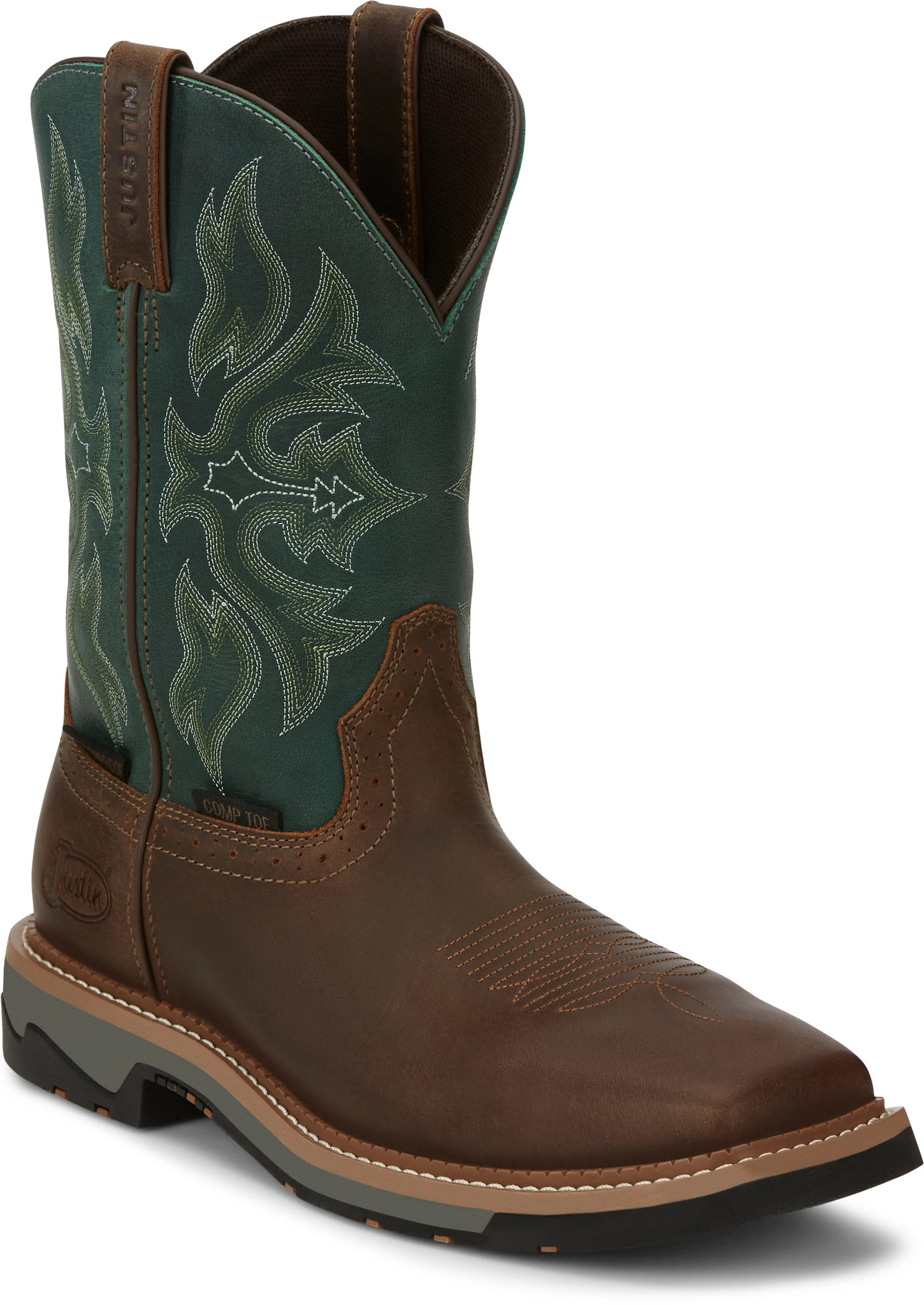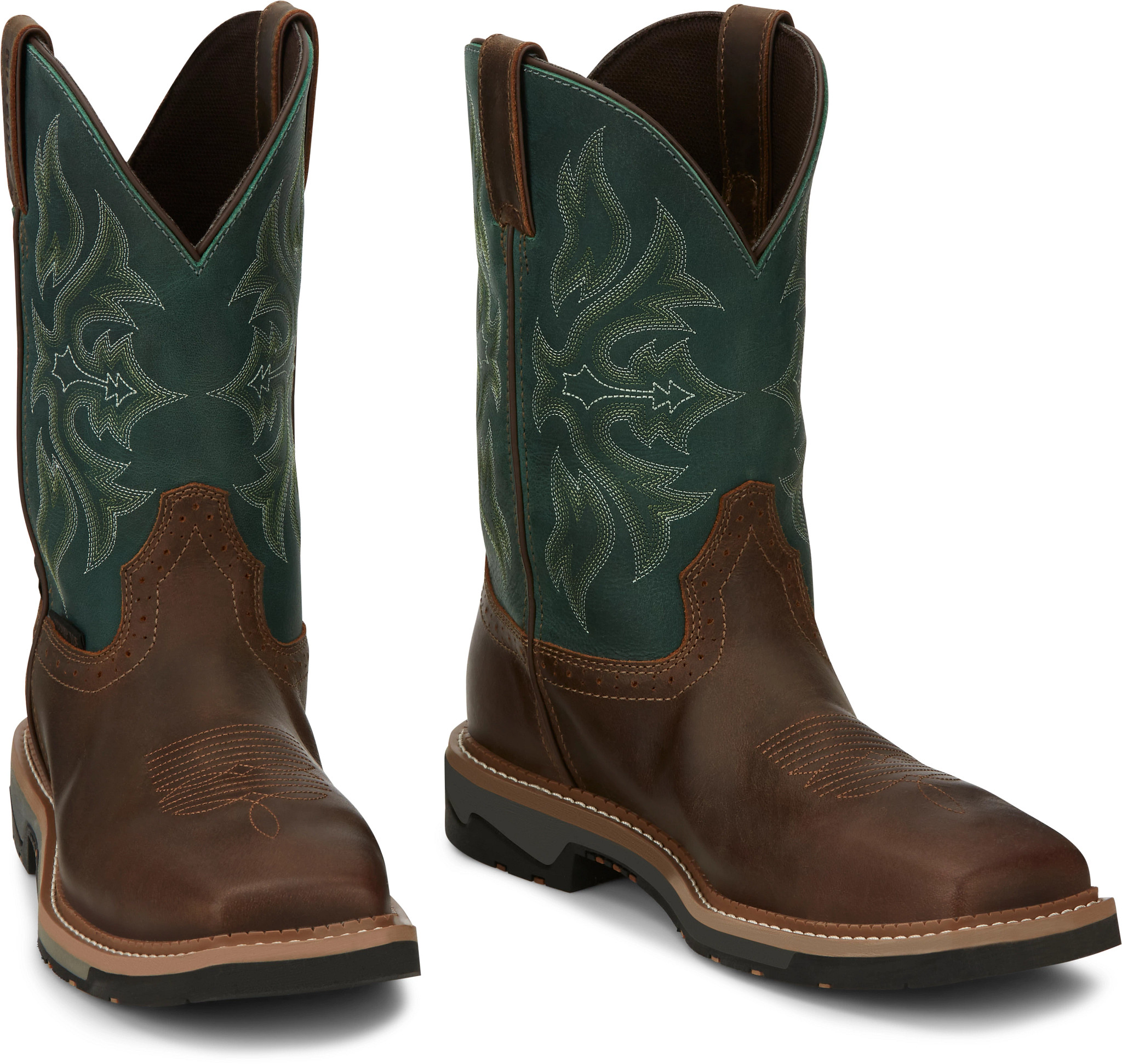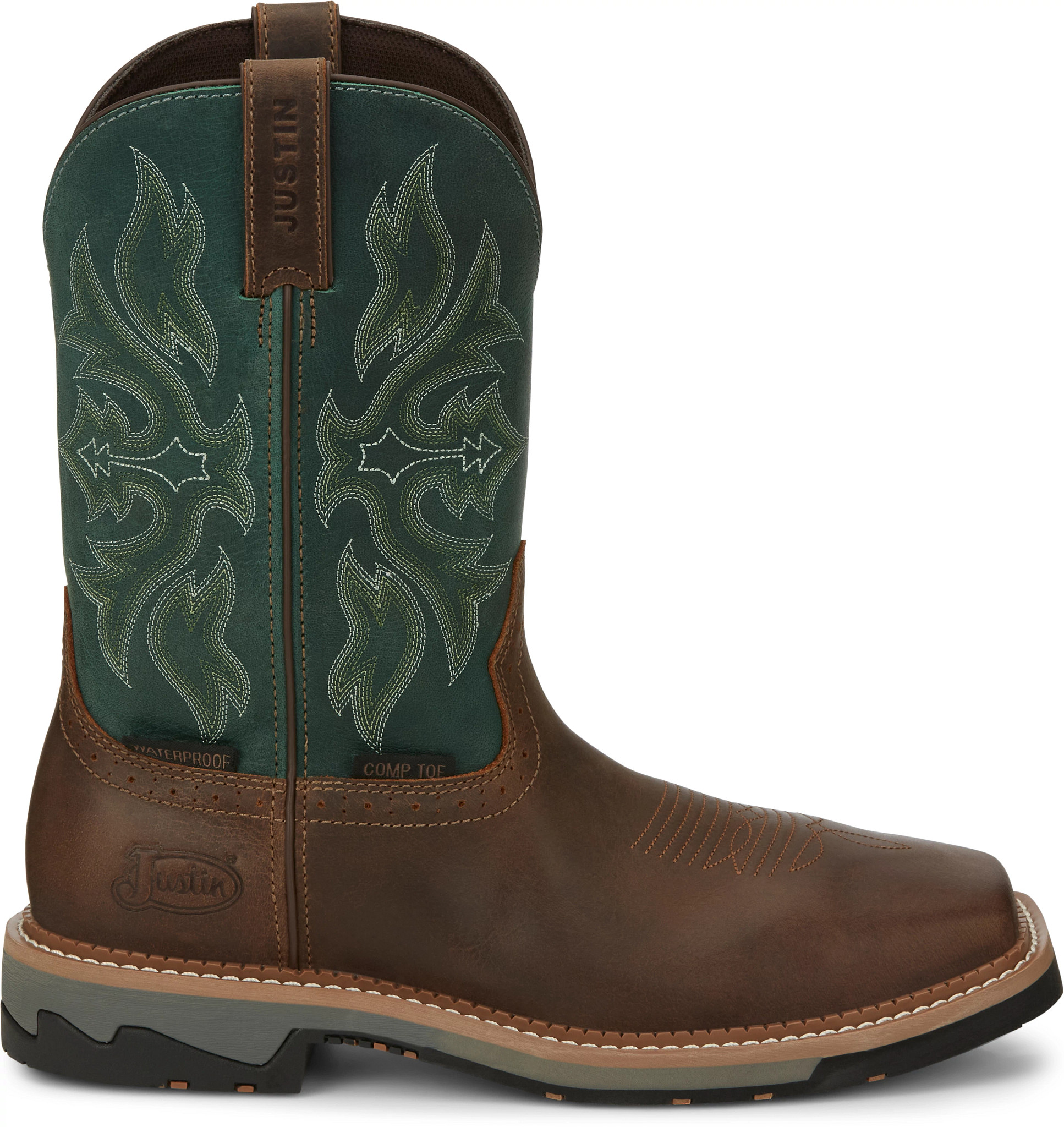 The 11″ Bolt Waterproof Work Boot from the Justin Stampede™ collection features aggressive traction to weather the impact on rough, hard or slippery surfaces you encounter on the job.