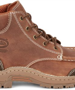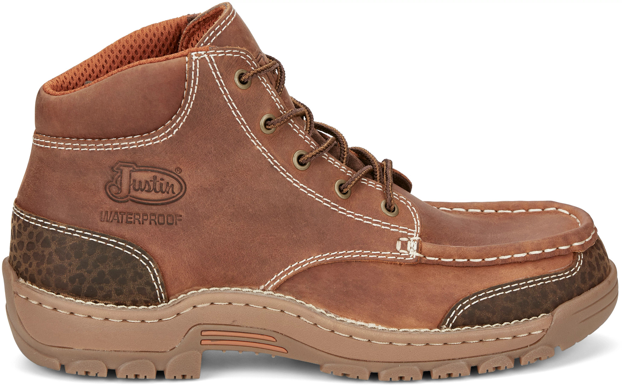 The 5” Corbett Waterproof EH Mocc Toe boot from our Stampede Light Duty collection is powered for work on-site or in the office and ready for play in brown cowhide with contrasting printed accents. Built with waterproof construction and an oil- and slip-resisting rubber outsole, this mocc toe lace-up features a removable Ortholite® insert for cushioned comfort. It’s Electrical Hazard Rated to meet ASTM F2982-11 EH standards.