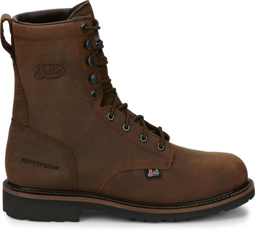 Ready for the job, the Justin Stampede™ Drywall Steel Toe is an 8″ tall Men’s work boot with a distressed beige waterproof leather exterior.