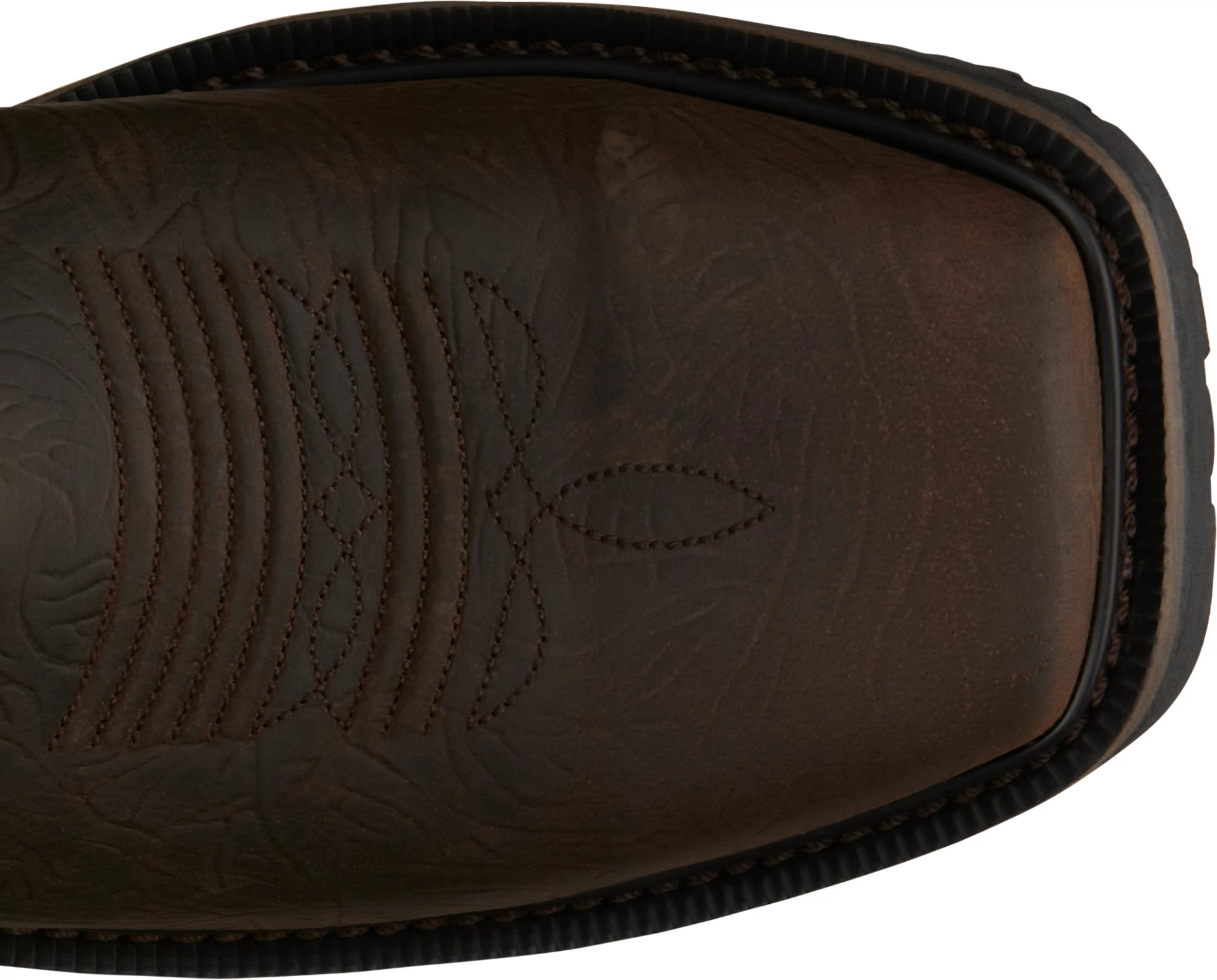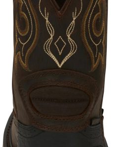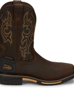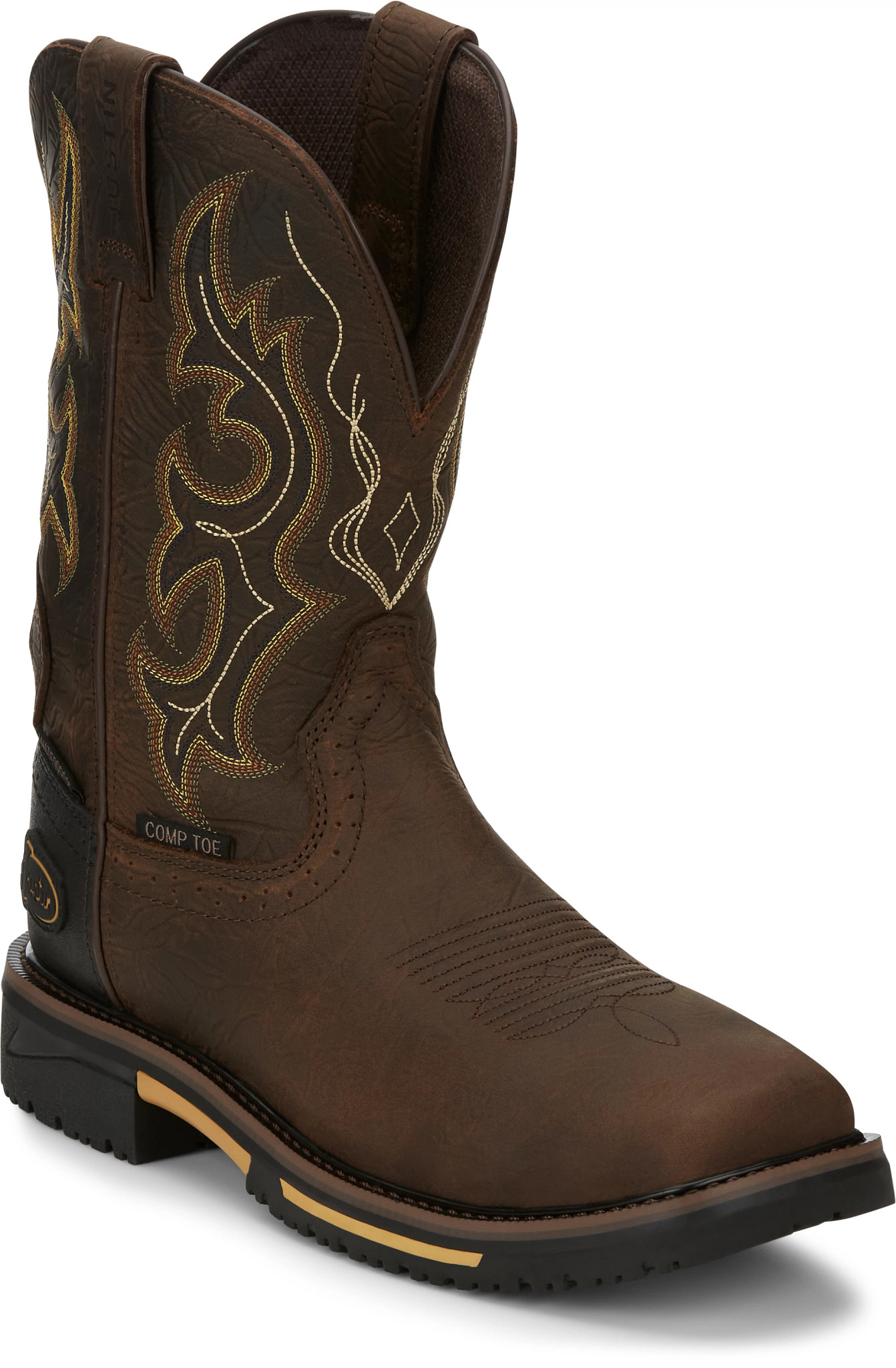 The leather exterior is waterproof and accented by a simple stitch pattern along the upper. This boot features layers of comfort with a J-Flex Flexible Comfort System® insole, the Justin Stabilization Technology®, Ortholite® Comfort Foam insole, and a Dri-Lex® cover. The composite toe provides security and comfort and meets safety standards without weighing you down. Its multi-density rubber and EVA combination outsole offers lightweight durability and meets the standards for electrical hazard footwear so you are guaranteed protection against open circuits of up to 18,000 volts. This boot also provides an Achilles Relief System® that eliminates weak spots in foot comfort by using stretchable material, high-density foam, and moisture-wicking anti-microbial lining to provide flexibility, support and breathability.
