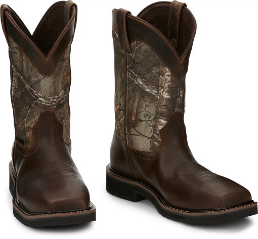 The RealTree® Mini X-Tra camo upper is paired with a polished brown leather vamp and collar. It features a waterproof exterior for added protection when up against the outdoor elements and a composition square toe for armor-like protection of your metatarsals that meets safety standards without weighing you down. The J-Flex Flexible Comfort System® insole cushions and supports your foot guaranteeing lasting comfort and meets ASTM F2413-11, I75, C75 EH safety footwear standards.