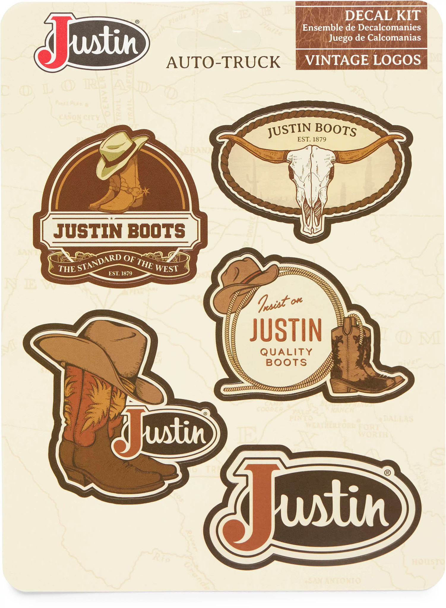 Show off your Western pride with this set of Justin Boots vintage-style auto decals. Featuring iconic logos and designs, these high-quality decals are perfect for adding a rugged, classic touch to your car, truck, or any flat surface. Durable and easy to apply, they celebrate the timeless craftsmanship and heritage of Justin Boots. Whether you’re a cowboy at heart or simply love authentic Western flair, these decals are a perfect way to express your style wherever you go.