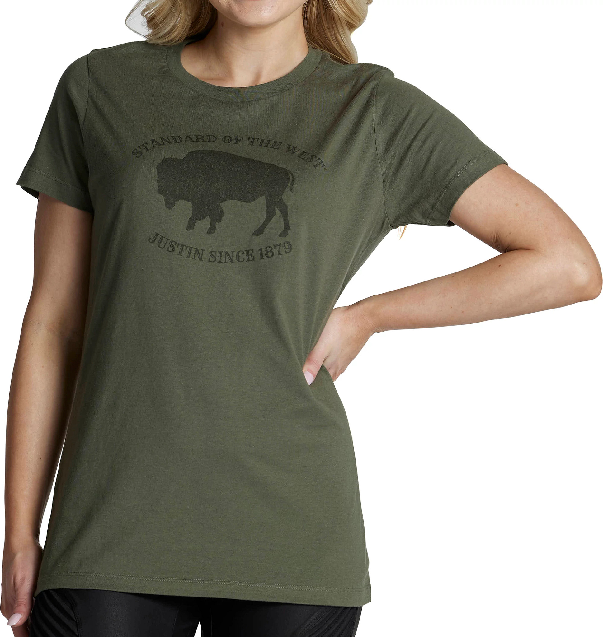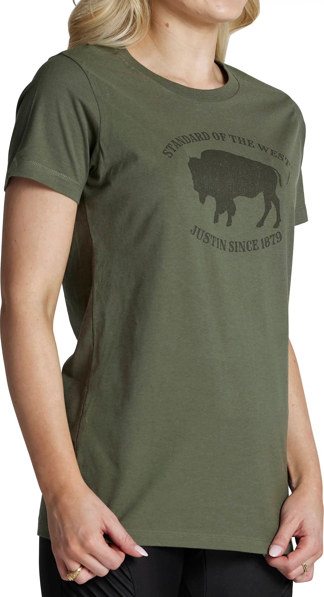 In soft olive cotton, this ladies fit bison tee has a timeless, laid-back look you’ll love.