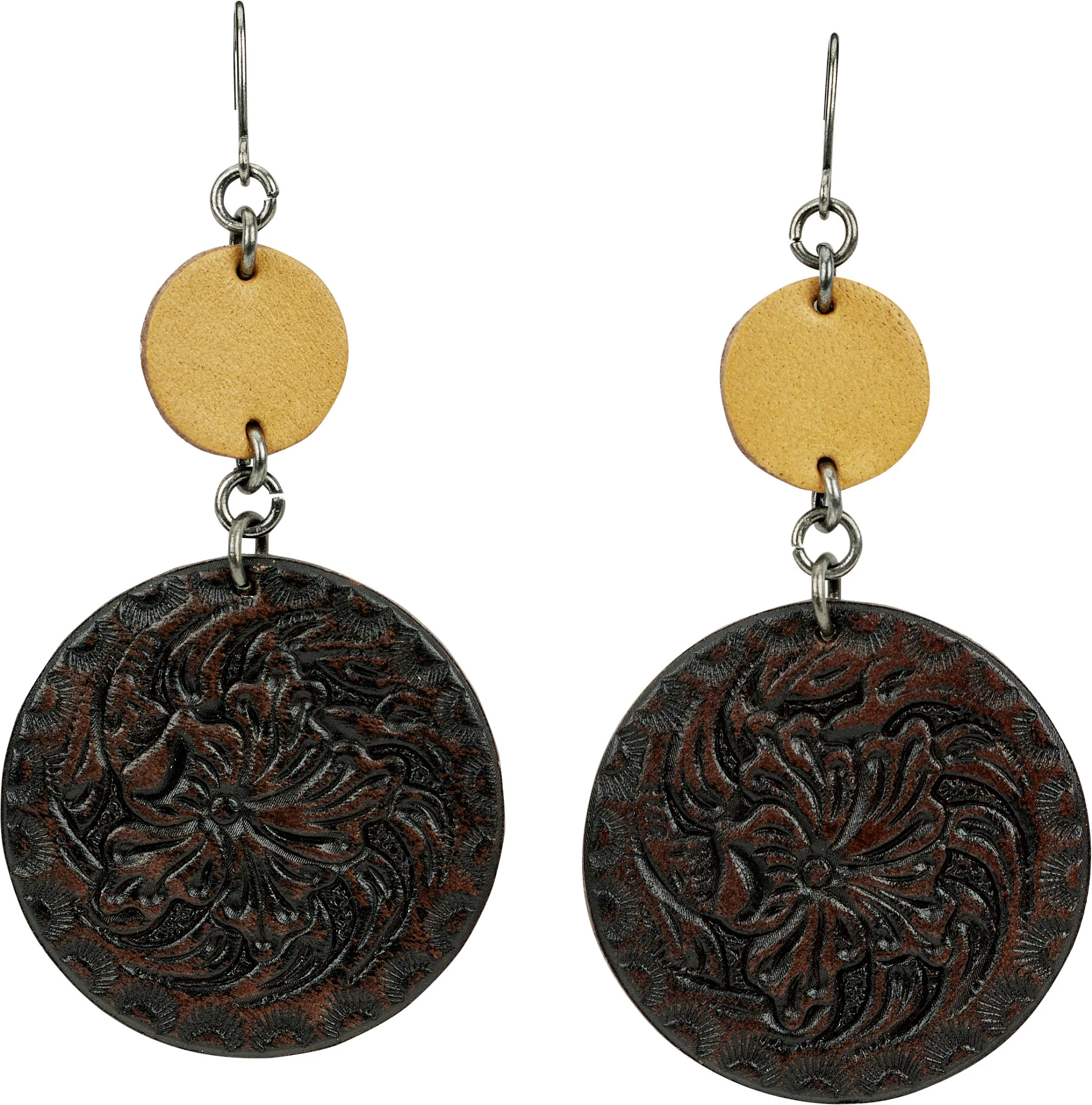 Elevate your style with these chic embossed leather disk earrings. Crafted from full-grain leather and adorned with intricate patterns, they bring a touch of artistic flair to any ensemble.