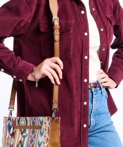 Elevate your accessory game with this stylish crossbody bag, featuring a vibrant woven pattern inspired by Southwestern designs. Accented with vegan leather details for a timeless look, it includes a spacious interior and an adjustable wide strap for versatile wear. Perfect for adding a touch of bold flair to your everyday outfits.