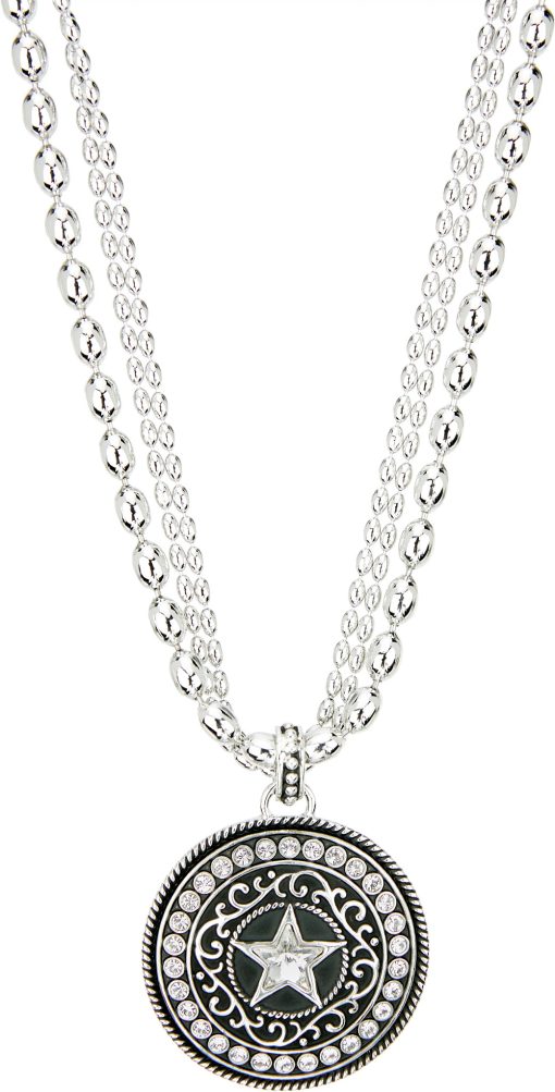This 18” silver necklace with 3” extender is made from zinc alloy with silver plating. It features a shield-shaped pendant with a black accent and a star in the middle.